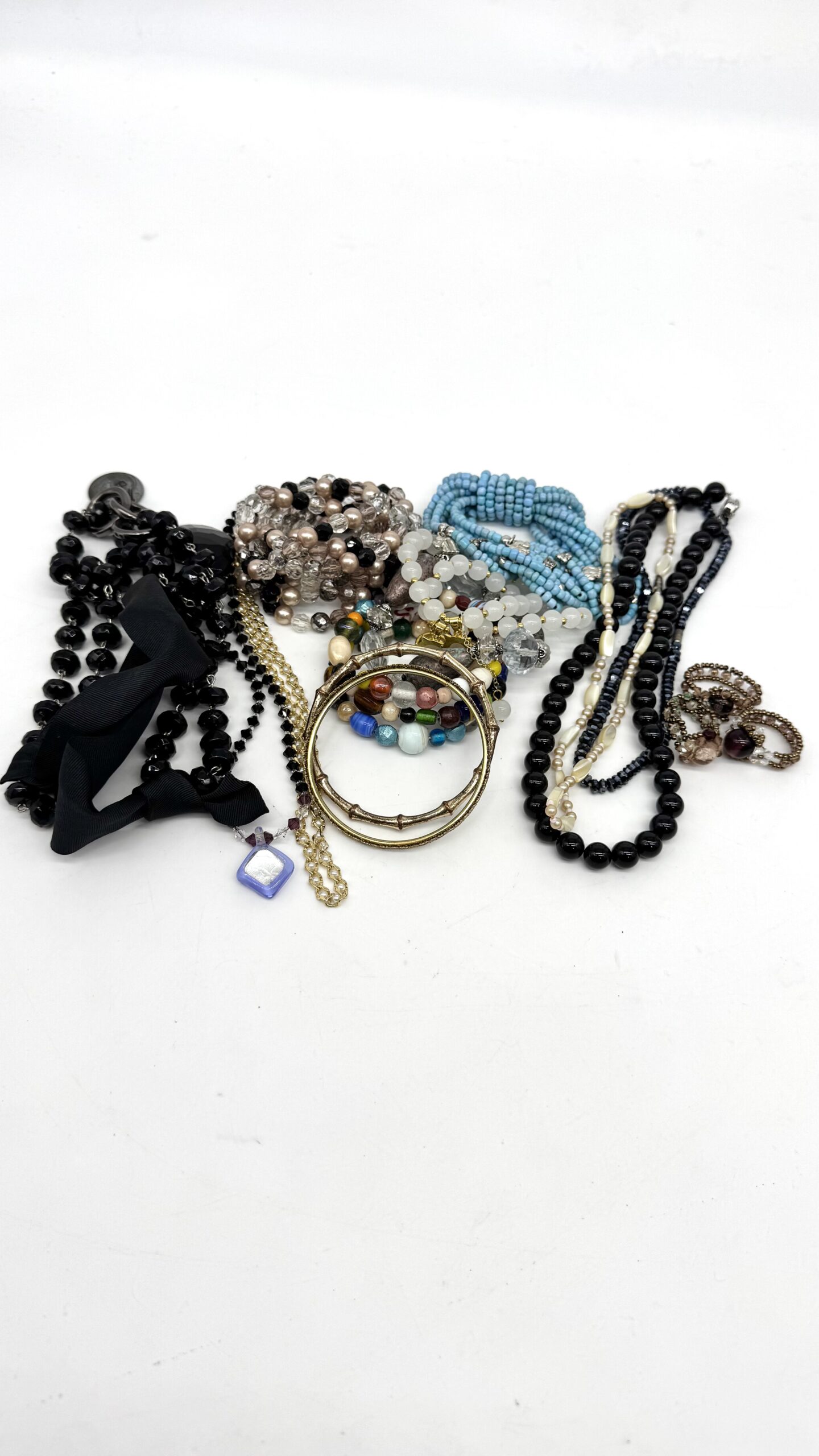 今回お買取りしたのは、イミテーションパールのネックレスとメッキ加工のブレスレットを含むアクセサリーです。ヴィンテージ調のデザインからシンプルな一連ネックレスまで種類が豊富で、冠婚葬祭向けとしても使える上品なアイテムが多く含まれていました。長期間の保管品ではあるものの、目立った変色や破損は少なく、全体的に状態良好と評価できる内容でした。