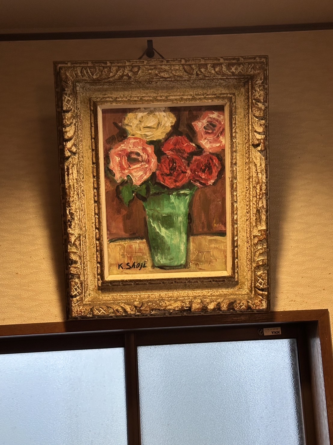 出張買取 大中小では、名古屋・愛知エリアを中心に絵画・美術品の出張買取を行っています。今回は、署名「K.Shoji」のサインが入った花の静物画(油絵)をお買取りいたしました。額装付きで保存状態も良く、落ち着いた色彩と力強い筆致が印象的な一枚でした。作者の詳細は不明でしたが、しっかりとした技法で描かれており、インテリアアートとしても需要のある作品です。