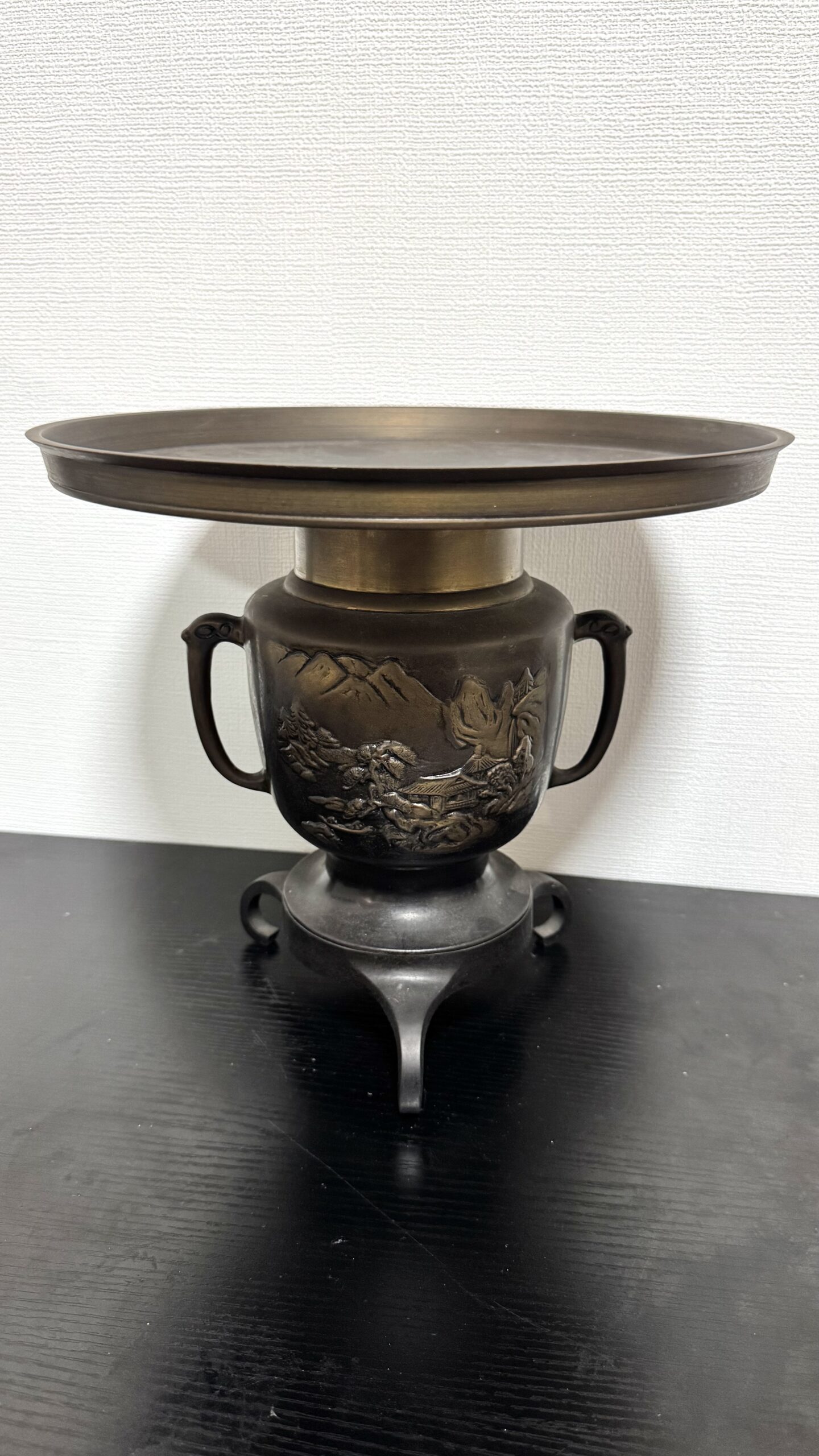 今回お買取りしたのは、山水風景の浮き彫りが施された銅製花器