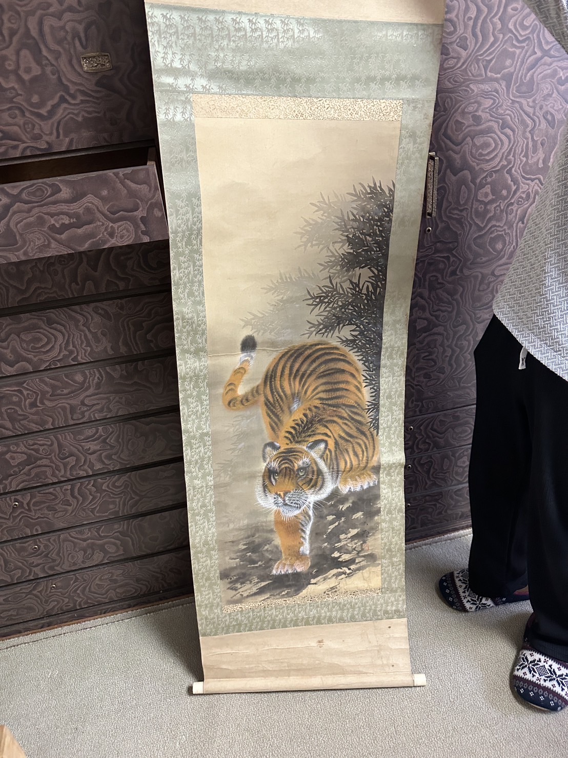 伝統的な日本画技法で表現された虎の姿は迫力があり、保存状態も比較的良好な一品でした。